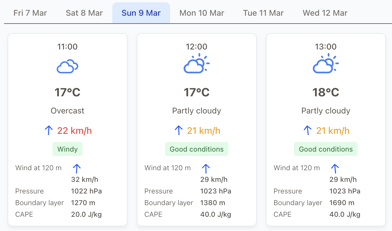 For each launch site, we show relevant information, including the weather forecast and recent flights.